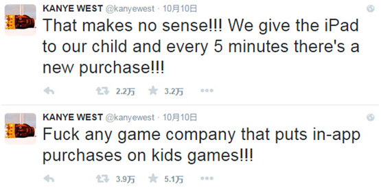 美国知名音乐人、说唱明星坎耶·维斯特(Kanya West)近日在推特直接爆粗怒喷游戏厂商。因为他与妻子金·卡戴珊两岁的女儿在用Pad玩一款游戏的时候频繁被诱导消费。“那些在儿童游戏中设置内购的游戏公司滚粗!”他在推特上写道,“我们把iPad交给孩子,结果是平均每隔5分钟就会产生一次内购交易。如果这是一款给两岁小孩玩的游戏,那就让他们好好玩,让家长们省省心吧!”