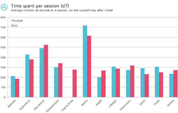 移动用户于应用安装后第七天在各类型应用上所花费的时间,蓝色为安卓平台,红色为iOS平台