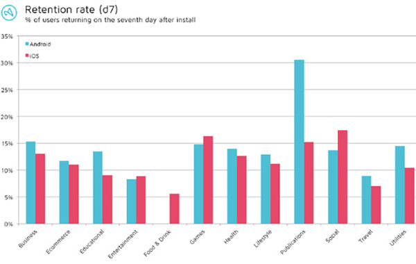 adjust使用自己的内部的API从10000款iOS应用与安卓应用上收集综合数据。虽然用户在游戏类应用上所耗费的时长比教育类应用高出了31个百分点,比新闻与杂志类应用高出了62个百分点,但是游戏类应用也存在着自己的问题,那就是用户留存。书籍与杂志类应用在七天之后的用户留存率远高于其他各类型应用,但是人们或许会在一开始时花费不少时间在一款游戏上,但是他们很快就会对这些游戏感到厌烦并卸载掉它。这就给移动游戏的开发商的长期货币化带来了新的问题。