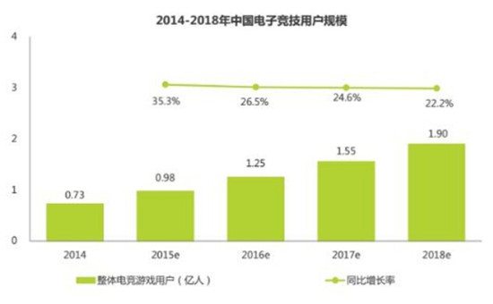 中国电子竞技发展至今,经历了从单机竞技、MMO游戏、到移动电竞的发展历程,越来越多的电竞模式应运而生,电竞用户也实现了跨越式的增长,据艾瑞2015年中国电子竞技市场研究报告显示,在2015年中国整体电竞用户数量激增到9800万人,预计到2016年全国电子竞技用户数量将超过1.2亿。