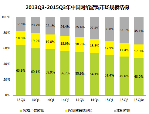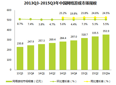 2015年Q3,中国网络游戏市场规模达到353.9亿,环比增长5.5%,同比增长24.5%。其中移动游戏占比升至35.1%,PC端游占比小于50%,达48%。