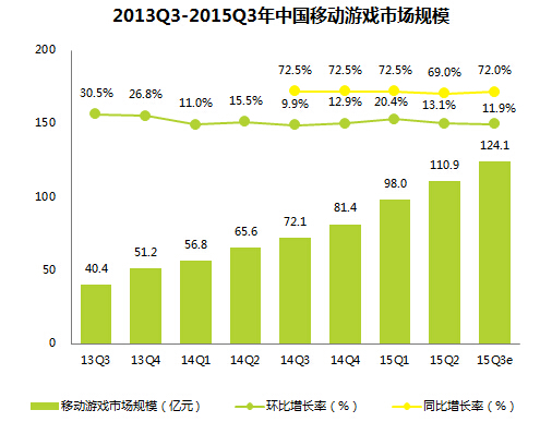 2015Q3 中国移动游戏市场规模达到124.1亿,依然保持2位数百分比的增长,艾瑞分析认为主要动力来自于:(1)适逢暑假大批学生用户有更多精力投入移动游戏;(2)继角色扮演、动作等类型之后,FPS、MOBA等更多重度竞技类游戏的市场被打开,尽管ARPU相对较低,但这类游戏更易于实现长生命周期;(3)IP泛娱乐继续深化,游戏、动漫、影视的叠加效应和联动推广,带动更多IP粉丝流入并发挥粉丝经济效应,游戏流水趋高。