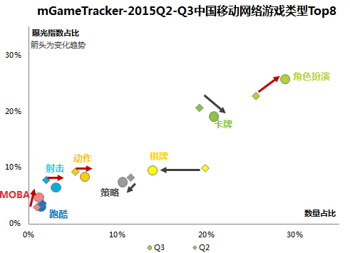 根据艾瑞的移动游戏市场监测产品mGameTracker统计的游戏类型数据显示,Q3的移动网络游戏类型呈现了明显的重度化趋势,曾经主导移动网游市场的卡牌类型被玩法更容易做深做广的角色扮演所取代,与此同时动作、射击、MOBA等重度类型的数量占比都有所上升。其中以射击和MOBA为代表移动电竞品类游戏开始通过长效性赛事运营等提升用户粘性和游戏生命周期,随着各大厂商加强对移动电竞的布局,这类游戏将能衍生至赛事、战队、直播等更大的外延经济。