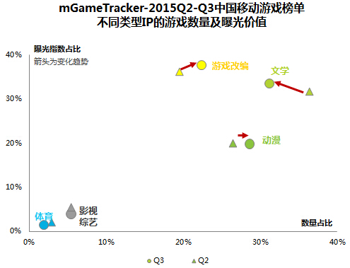 IP泛娱乐是Q3手游市场的重心之一,在各类IP手游中,(1)游戏IP依然是曝光价值最大的类型,随着各大端游厂商对其经典IP价值的进一步挖掘以及老牌单机、街机IP发力,其曝光价值将继续提升,但这类IP的极度稀缺导致同一IP易被反复利用压榨价值,培育新的游戏IP成为课题;(2)文学类IP得益于以《花千骨》为代表的网络文学通过影视剧改编带来的联动效应,推动了曝光价值上升,而网络文学庞大作品库数量和改编影视、动漫泛娱乐效应将推动这类IP游戏的市场进一步扩大;(3)国内二次元市场的火爆让动漫IP游戏的数量上涨,但整体的曝光价值则与Q2持平,二次元用户群体的特殊性造成这类IP不能依靠简单换皮,需更深入地针对用户特性进行游戏开发和运营才能吸引用户留存。