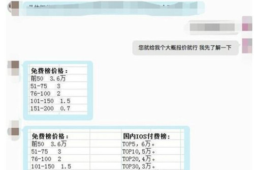 某刷榜负责人给了记者一个报价:免费榜价格前50名大约需要3.6万;51-75需要3万;76-100名需要2万。国内iOS付费榜TOP5需要6万;TOP10的费用是5万;TOP20的费用为4万;TOP30费用3万,而且是预付。
