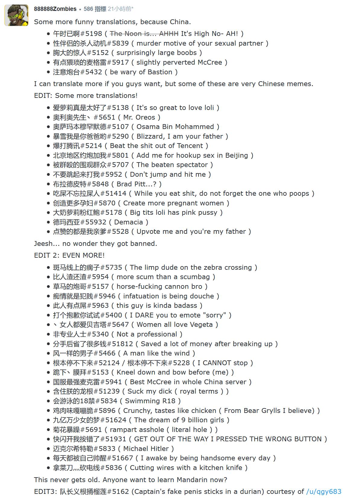 外媒Kotaku近日发了一篇文章《China's Banned Overwatch Players Have Excellent Names》(中国《守望先锋》被封玩家起了超级棒的名字),文章里把部分中文ID翻译成了英文,比如“杀你杀到我厌倦(Killing you makes me tired)”、“这个世界需要更多的屁股(The world needs ass)”。