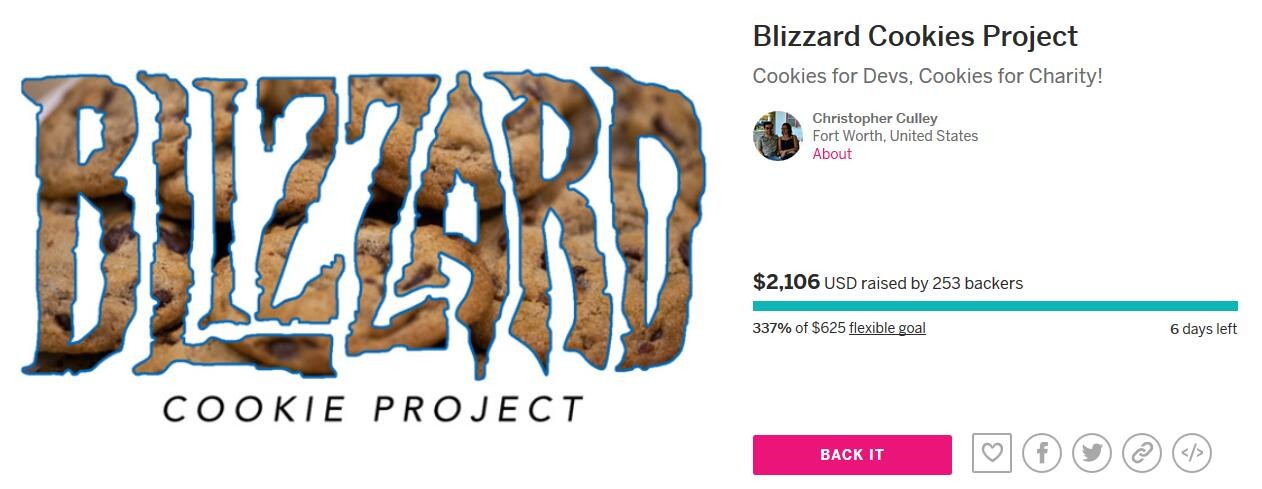 而如今看来,支持他的人不在少数,众筹已经取得了很棒的成绩,虽然还有六天到期,Culley已经募集了2106美元,已经超过原计划目标额337%,有253位玩家参与了活动,Culley表示自己已经开始就此事着手联系暴雪方面了。其实类似的活动很早就有过一次,一群《质量效应》的粉丝为Bioware送去了400个杯子蛋糕。